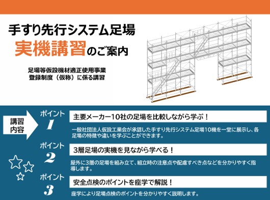 この講習は足場等仮設機材適正使用事業者登録制度の事業者登録に必要な講習の一部となるものですが、国内主要足場の実機を一度に見ることができる希少かつ有用な講習であり、所属事業者の登録の予定に関係なく、どなたでも受講することができますので、多くの方に受講いただくことを推奨します。